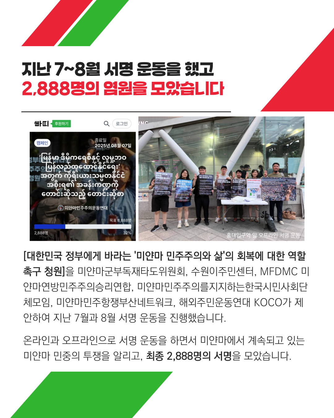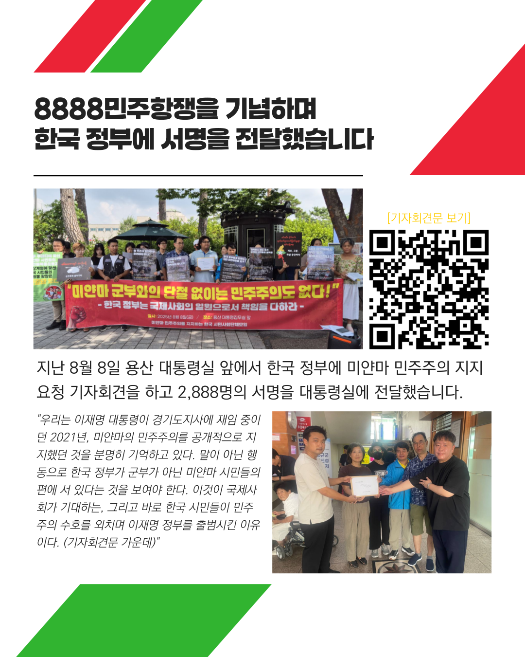 해외주민운동연대(KOCO) 포함, 6개 단체로 구성한 '미얀마민주화운동연대'는 미얀마 민주주의 실현을 위한 '대한민국 정부의 역할'을 촉구하는 청원 서명을 지난 7월 진행, 총 2,888명의 서명이 담긴 청원서는 지난 8월 8일, 8888 민중 항쟁 기념 기자회견을 통해 대통령실에 전달했다.