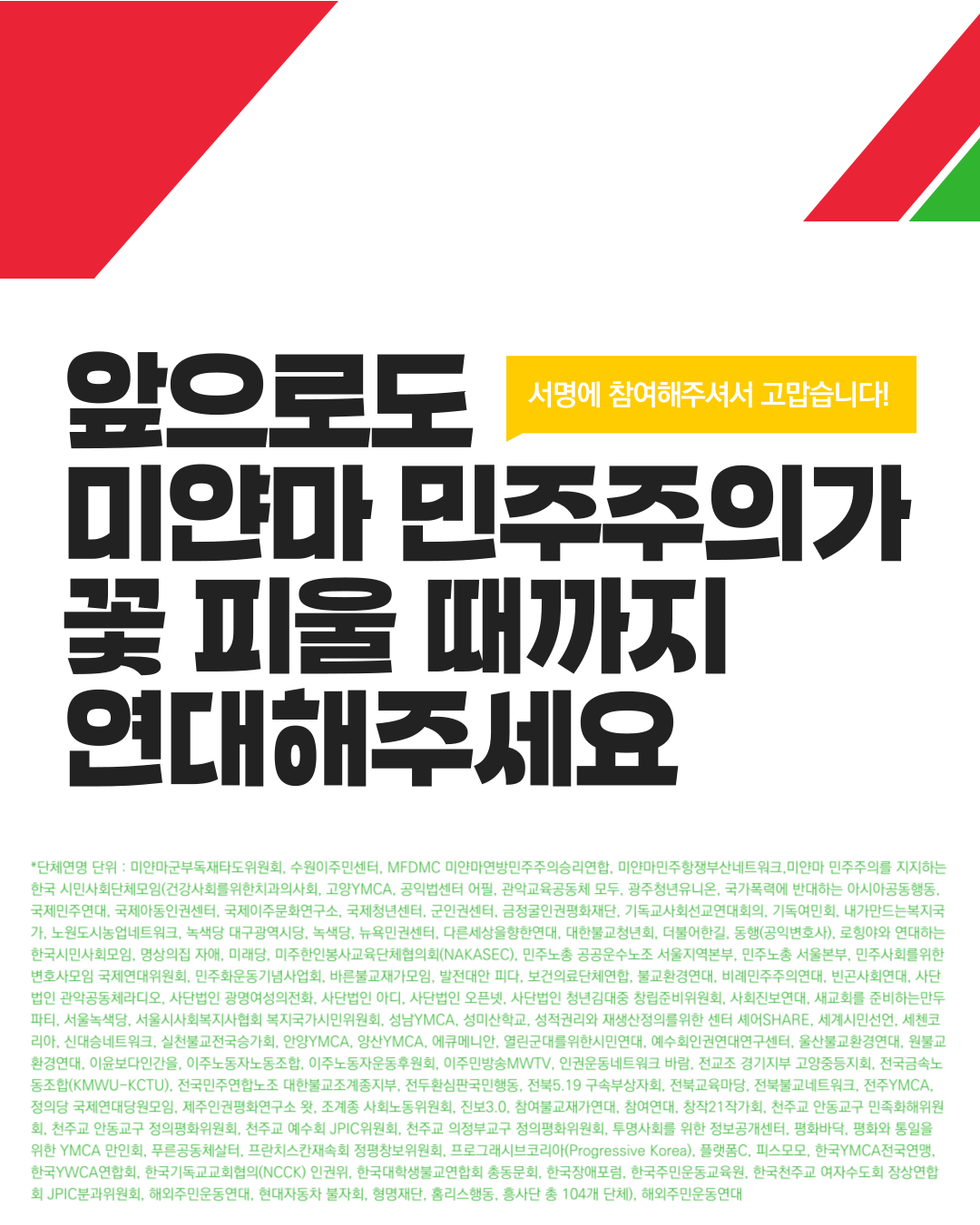 # 미얀마민주주의지지한국시민사회단체모임, 미얀마민주항쟁연대부산네트워크, 군부독재타도위, 미얀마연방민주주의연합, 수원이주민센터, 해외주민운동연대 드림
