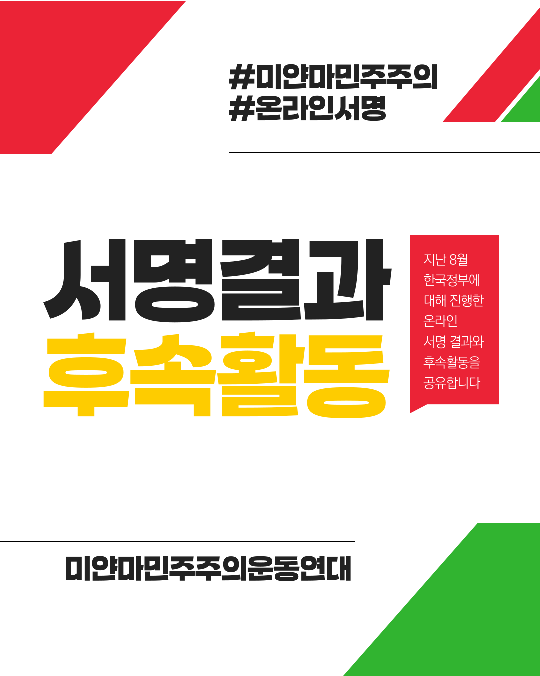 미얀마 군정은 오는 12월 28일 미얀마 총선을 실시하겠다며, 안/밖으로 공안정국을 조성하고 있습니다. 한국사회의 연대가 다시 한번 중요한 지점에 서 있다. 정당한 선거를 요구하는 미얀마 시민의 목소리가 허망한 메아리가 되지 않도록, 시민 한분한분의 꾸준한 관심이 한국 정부의 정의로운 입장을 견인해 낼수 있기를, 미얀마 시민의 투쟁이 더 이상 거리의 붉은 자욱으로 남겨지지 않기를 간절히 바라며,