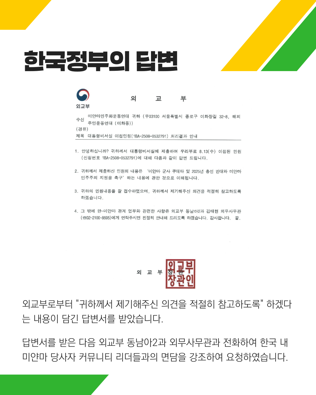 외교부는 '본 청원의 내용을 미얀마 관련 논의 시 적절히 반영하겠다'는 답변을 우편과 메일로 전달해 왔다. 이후 해외주민운동연대는 외교부 동남아 2과의 외무사무관과 통화하여, 본 사항의 진의를 다시 한번 전달하고, 국내 미얀마 커뮤니티 리더들과의 면담을 재요청하였다.