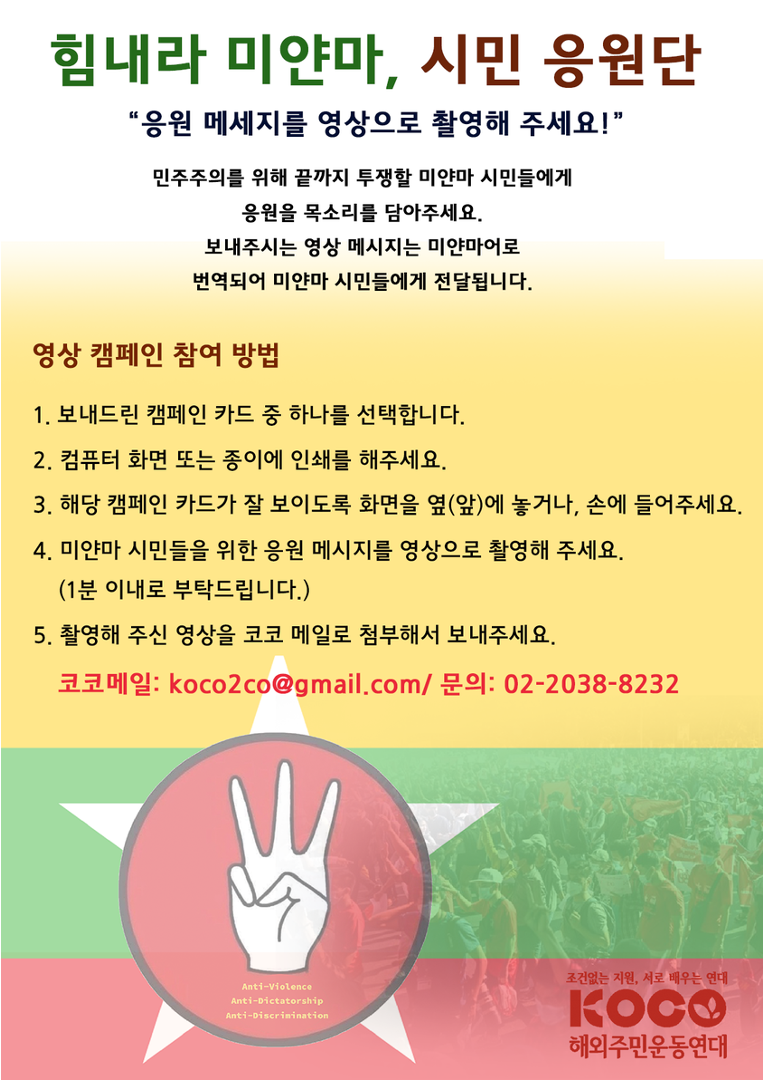 코코는 시민응원단을 모집하고, 우리의 목소리를 미얀마 주민들에게 전달하려고 합니다.