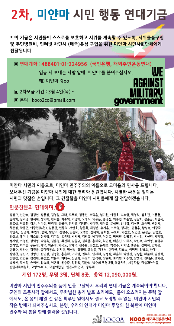 시간시간 관심 가져 주시고, 코코를 믿고 미얀마 민주주의를 위한 시민행동 연대기금에 참여해 주셔서 진심으로 감사드립니다.